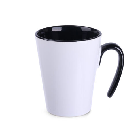 An original mug with a modern “open” handle. It has an interior in 4 colors to choose from and a matching handle. Its straight walls are perfect for large decorations.