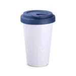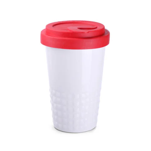 Mobiler Designer-Becher aus Porzellan. Es hat eine charakteristische Oberfläche des unteren Teils in Form einer geometrischen Struktur. Das Modell ist für aktive Menschen, Liebhaber von Ausflügen und Reisen bestimmt. Dank der seltenen inneren Struktur aus doppelten Porzellanwänden zeichnet er sich durch eine erhöhte Wärmeisolierung aus. Er hat einen Deckel mit festem Verschluss, erhältlich in Farben.